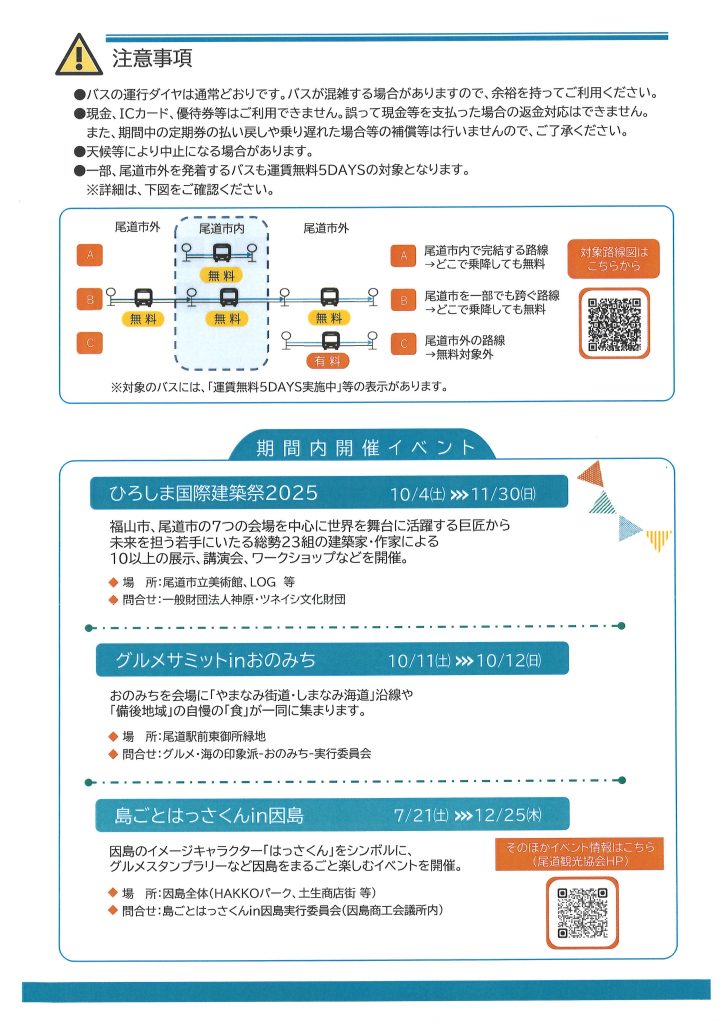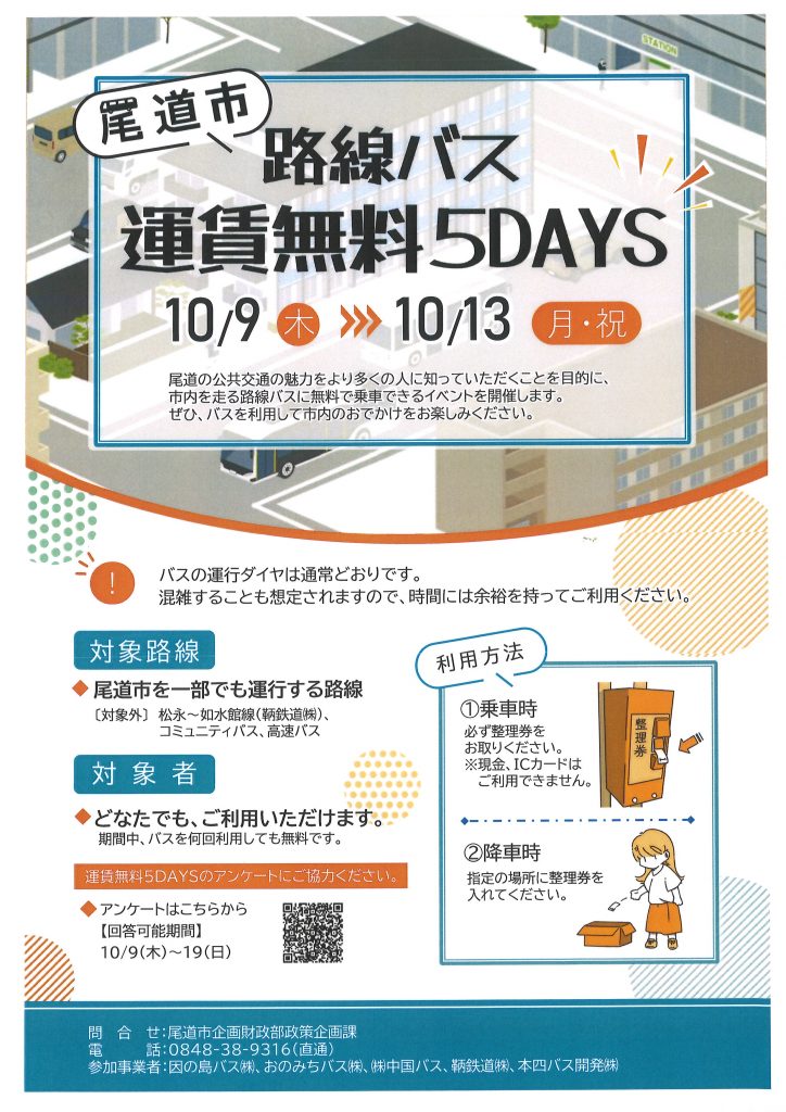 10/9(木)~10/13(月・祝)尾道市路線バス運賃無料5DAYSの実施について