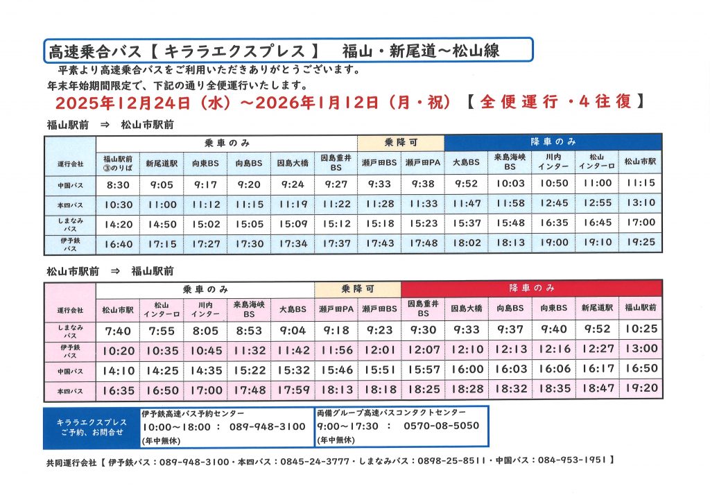 平素より、「本四バス」をご利用いただきありがとうございます。福山・新尾道⇔松山線(キララエクスプレス)につきまして、下記期間中は全便運行(1日4往復)いたします。