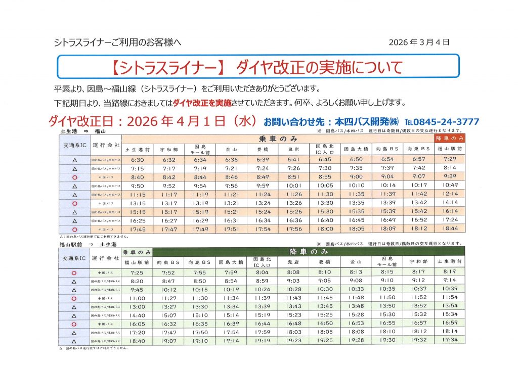 高速乗合バス:シトラスライナー【因島・向島 ⇔ 福山線】 2026年 4月 1日(水)ダイヤ改正!!